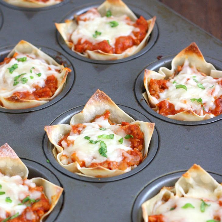 - Generously spray 12 muffin cups with oil; line each with a wonton wrapper. Fill each with 1 tablespoon ricotta mixture and 1-1/2 tablespoons pasta sauce. Top each with a second wrapper, rotating corners and pressing down centers. Repeat ricotta and sauce layers. Sprinkle with remaining cheese blend.
