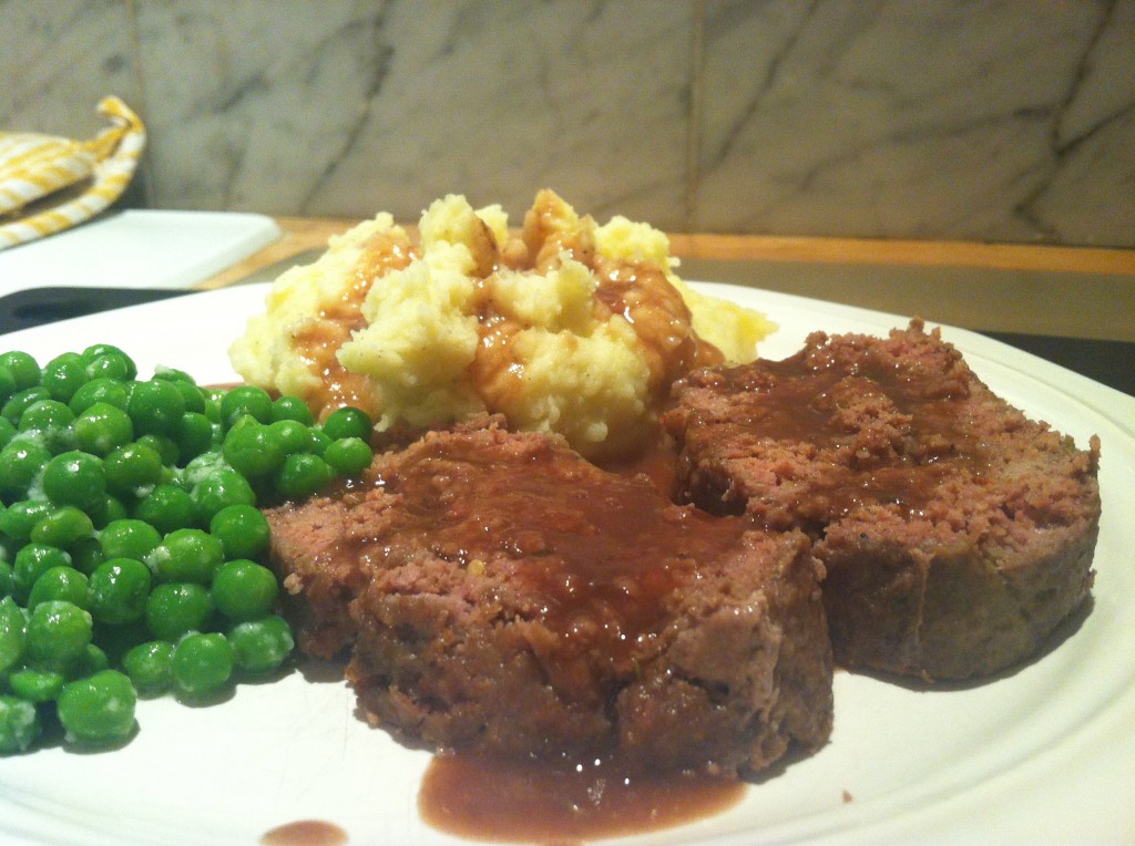 About 40 minutes before meatloaf finishes baking, start boiling your peeled, cubed potatoes. When cooked, pour off water and mash with butter, cream, salt and pepper to taste. About 15 minutes before meatloaf comes out of the oven, steam some green peas – frozen are fine! Add a little butter to them after steaming.
