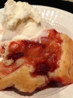 Reserve ½ cup fruit mixture, then add remainder to baking dish distributing evenly. Spread dough/batter over it, spreading evenly. Drizzle reserved ½ cup fruit mixture over dough/batter. Bake until a cake tester or wooden pick inserted into center of cake portion comes out clean, 25 to 30 minutes depending on size cake pan used. Cool in pan on a rack 5-10 minutes. Best served warm with a scoop of your favorite vanilla ice cream.