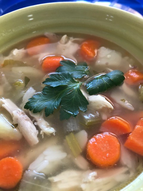 In large soup or stock pot, put chicken and gizzards with stock and add more water so that it barely covers the chicken. Add bouillon, onions, carrots, celery, parsley, Worcestershire sauce, garlic powder, bay leaves, about 2 tsp salt and a few shakes of black pepper. Bring to a low boil and simmer for 1/2 hour, then add the potatoes. This will keep the potatoes from getting mushy and disintegrating. Continue to simmer at a low boil for another hour, occasionally turning chicken over. When legs are falling away from the chicken, soup is done. Remove chicken, place in a large bowl and cut up with poultry shears to allow chicken to cool enough so you can comfortably remove the meat from the bones. Remove bay leaves and skim off any “scum” from the top of the soup. Remove all meat from carcass, tearing into edible chunks. Put chicken pieces back in pot, add cooked rice and stir. Sometimes, I leave the rice on the side and put some in each bowl before ladling the soup on top. Add extra salt and pepper to individual taste. Serve with warm bread. I recommend a nice fresh French bread or Big Y’s Snowflake rolls!