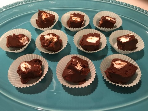 Grease 9 X 6 1/2″ pan with butter; set aside. Melt 10 regular or 100 mini marshmallows with water in either a non-stick 2 quart saucepan or a regular 2 quart saucepan very lightly sprayed with cooking oil spray (vegetable, not olive). In separate pan, boil milk with sugar for 6 minutes; stir continuously. Add to melted marshmallows. Add chocolate chips and butter. Let cool, but don’t let it get too stiff. While pourable, stir in cup mini marshmallows and pour into greased pan. Cover with plastic wrap or Press-n-Seal. Refrigerate for several hours or overnight. Cut into bite sized pieces and enjoy!!